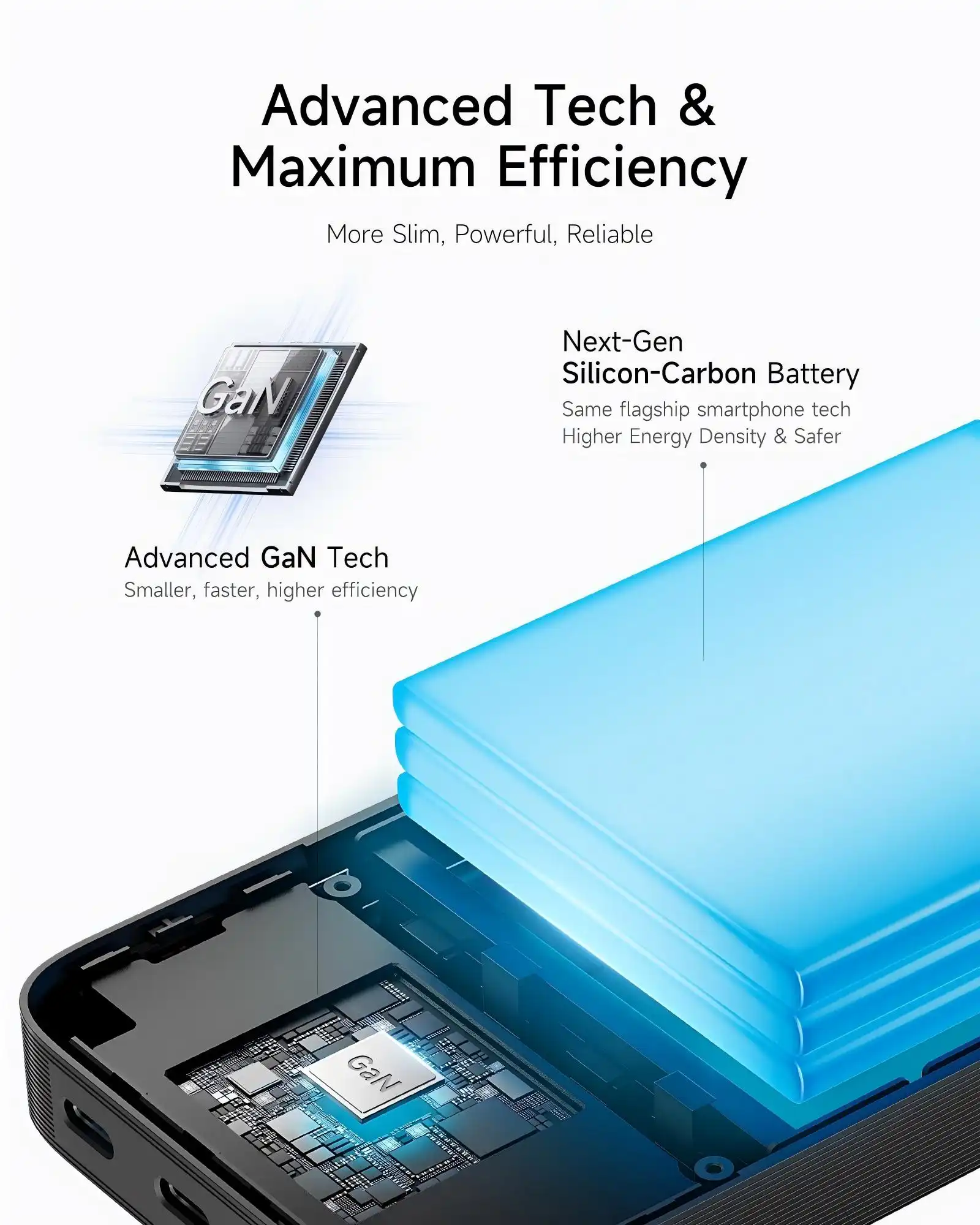 Advanced GaN Technology with Smart Display and Safety FeaturesIncorporates GaN and silicon-carbon cell technology for faster, cooler, and more efficient charging. The TFT color display provides real-time information on battery level, input/output power, and estimated recharge time. Built-in thermal management ensures safe and reliable operation for both the power bank and connected devices.