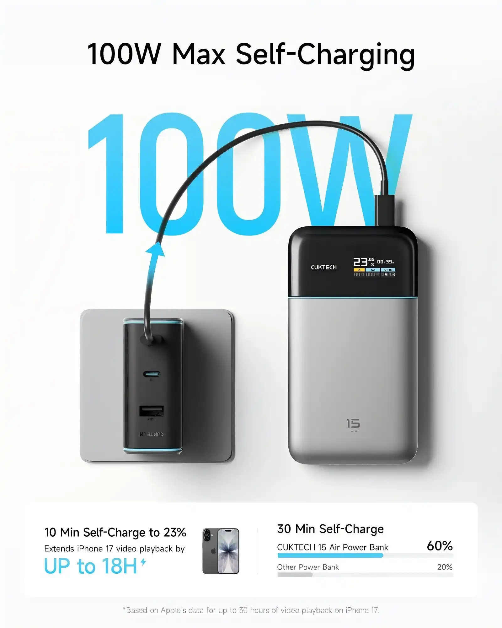 15,000mAh Capacity for All-Day Use Equipped with a 15,000mAh battery, it provides sufficient power to charge an iPhone 17 Pro Max approximately 1.6 times or a Samsung S25 Ultra approximately 2.2 times. Perfect for long days away from a power outlet.