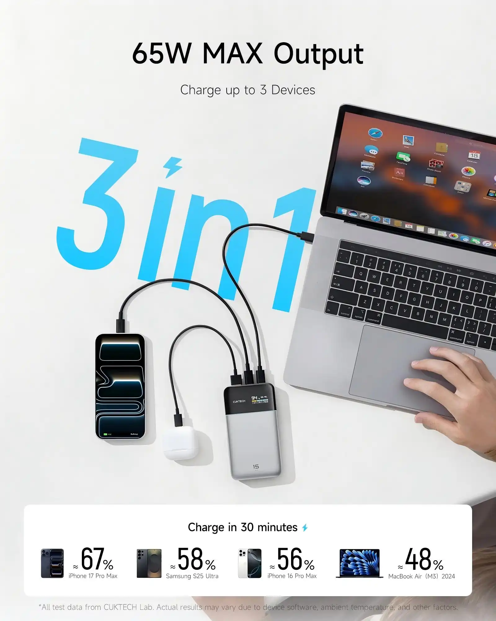 65W USB-C Fast Charging for Laptops and SmartphonesDelivers a reliable 65W USB-C output capable of charging laptops including MacBook Air/Pro, Dell XPS, and Lenovo devices. Achieve up to 48% charge on a MacBook Air M3 or 67% on an iPhone 17 Pro Max in just 30 minutes.