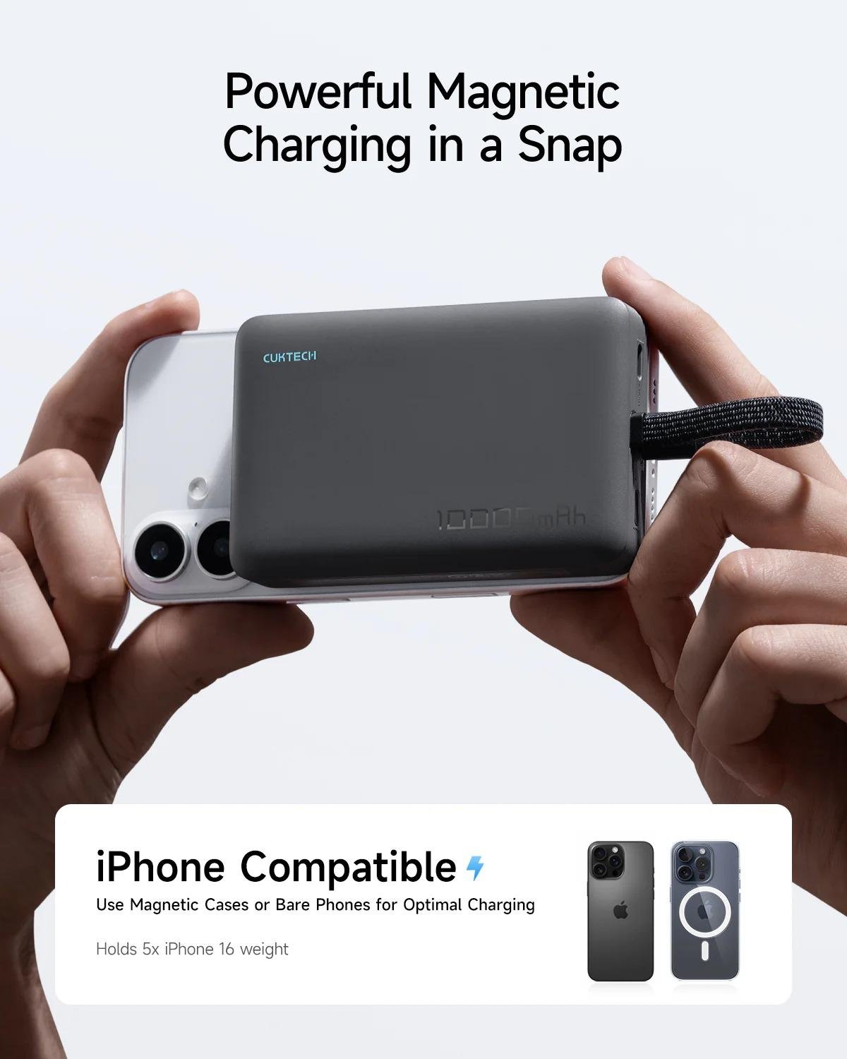 ENERGY THAT LASTS ALL DAY Stay connected longer with a high capacity 10,000mAh battery – enough to charge your iPhone 16 up to 1.8 times. Ideal for work, travel or full days on the go.