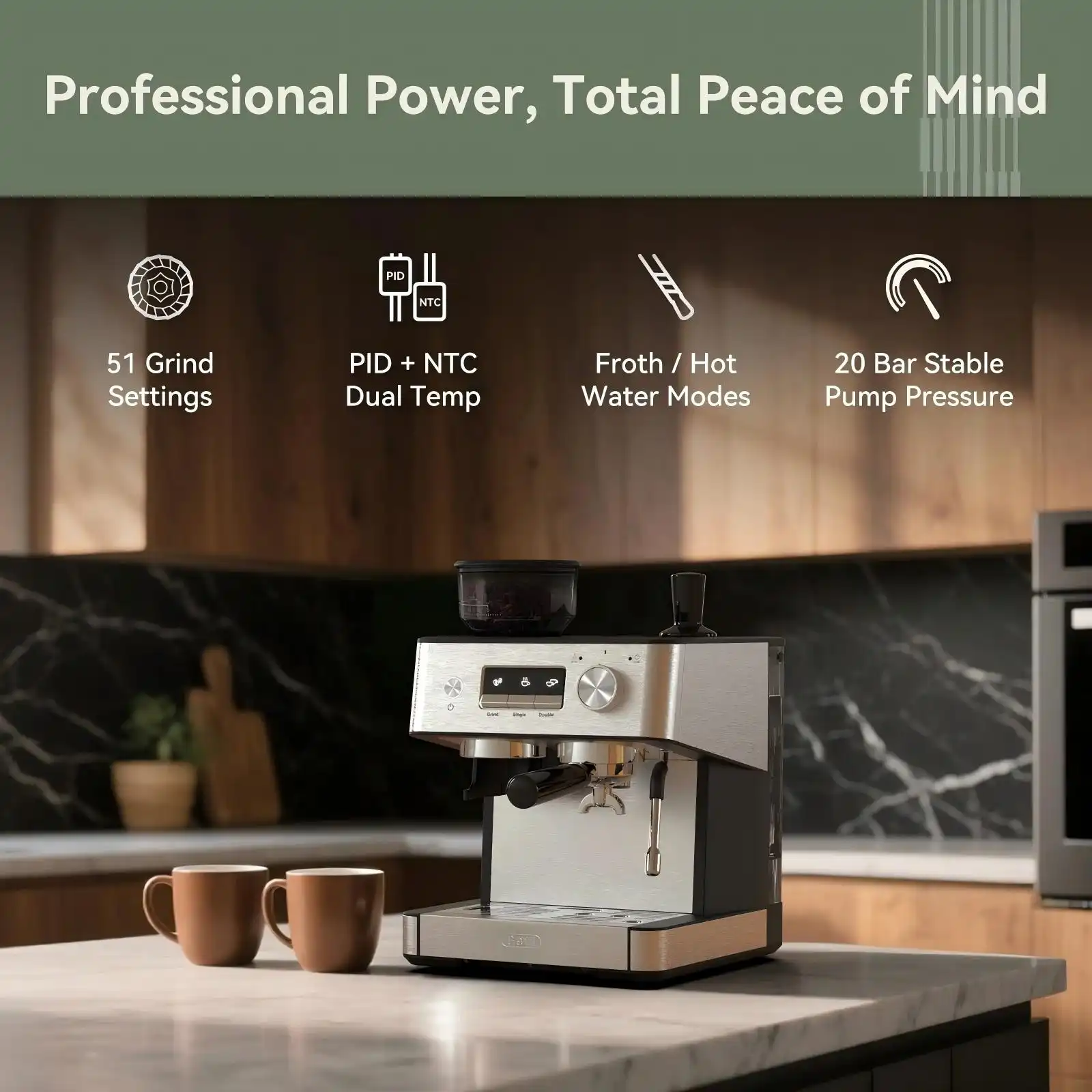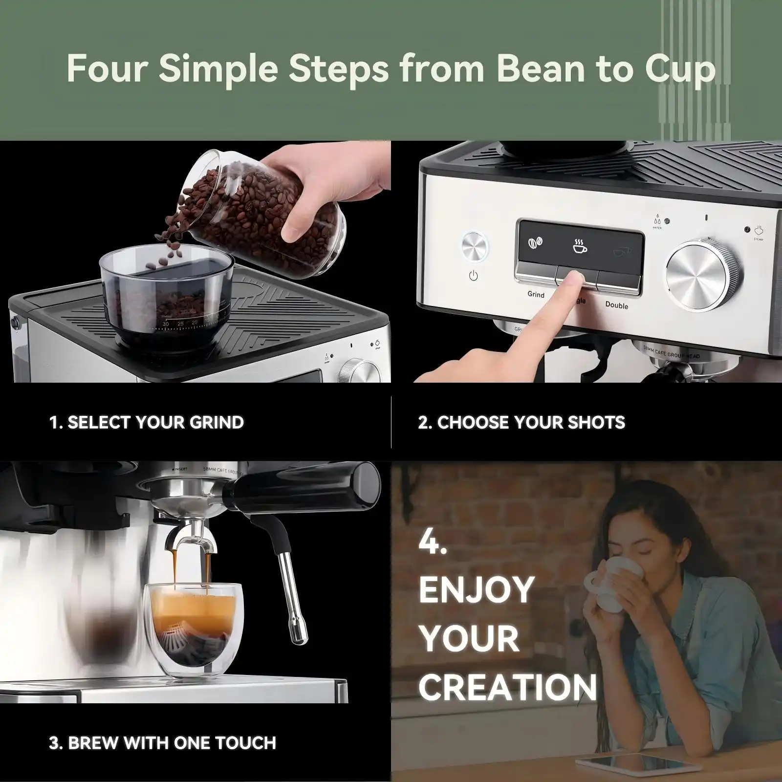 Bean-to-Cup Convenience: Go from whole beans to fresh espresso in under a minute with built-in burr grinder. Effortless One-Touch Brewing: Barista-level coffee in 3 simple steps with just 4 buttons and 1 knob. Total Grind Control with 30 Precision Settings: From coarse to ultra-fine, dial in the perfect grind for every