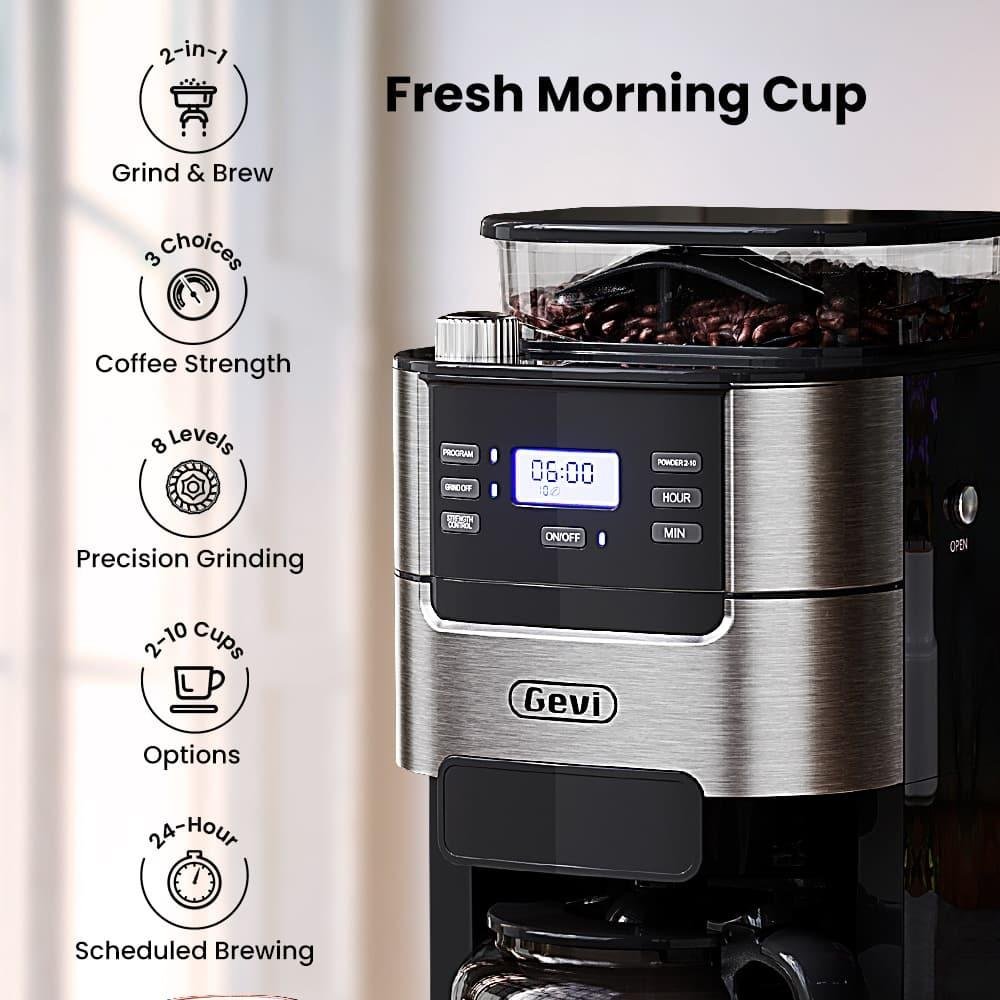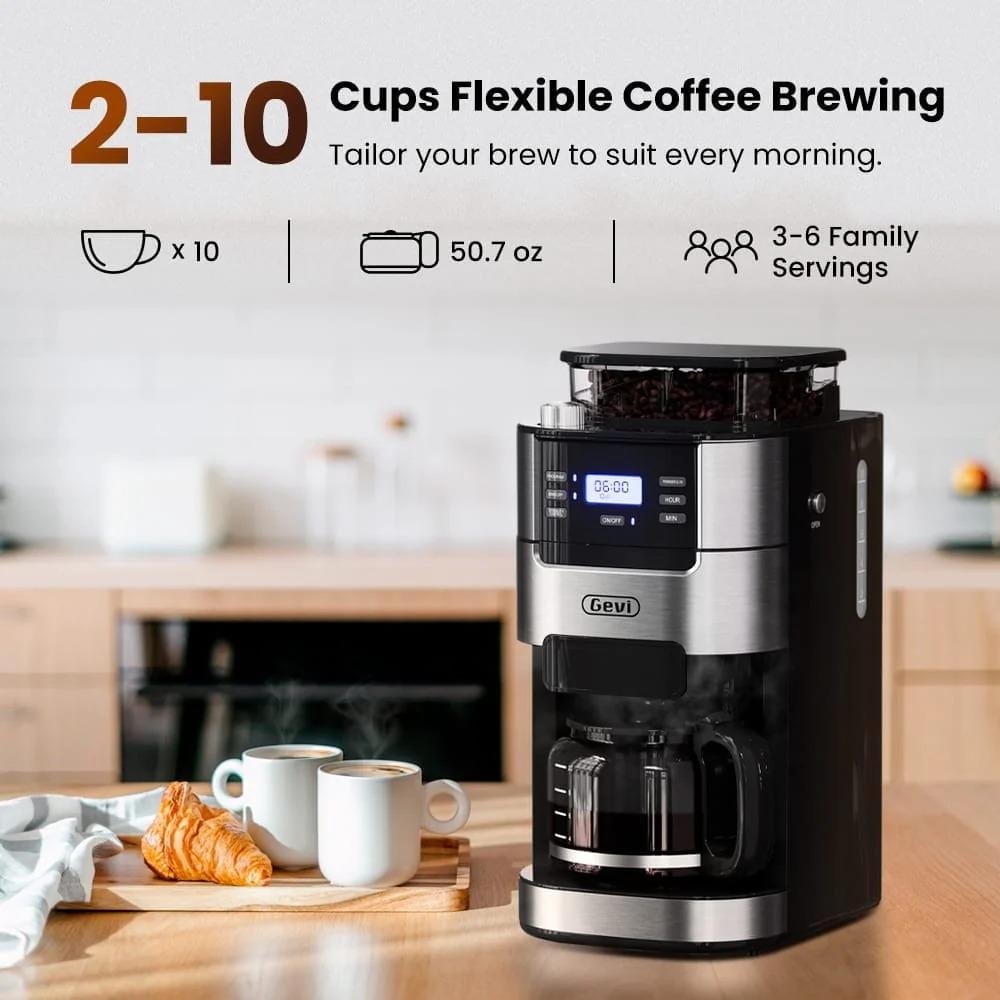 GEVI grind and brew coffee maker machine features a built-in grinder for fresh beans and a 10-cup capacity, perfect for families. Set the alarm for fresh coffee in the morning and enjoy the warm function, keeping coffee hot for two hours.